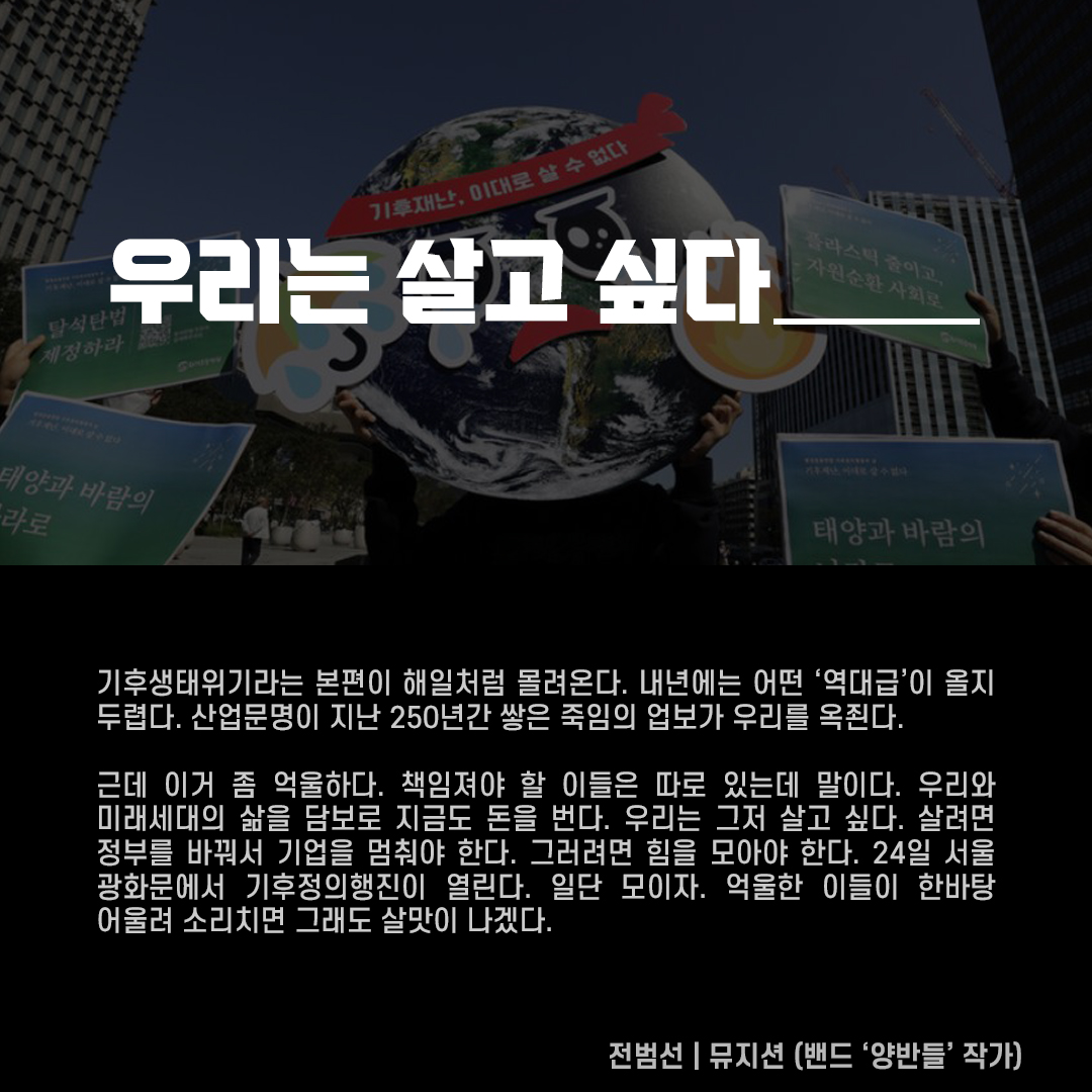 근데 이거 좀 억울하다. 책임져야 할 이들은 따로 있는데 말이다. 우리와 미래세대의 삶을 담보로 지금도 돈을 번다. 우리는 그저 살고 싶다. 살려면 정부를 바꿔서 기업을 멈춰야 한다. 그러려면 힘을 모아야 한다. 24일 서울 광화문에서 기후정의행진이 열린다. 일단 모이자. 억울한 이들이 한바탕 어울려 소리치면 그래도 살맛이 나겠다."