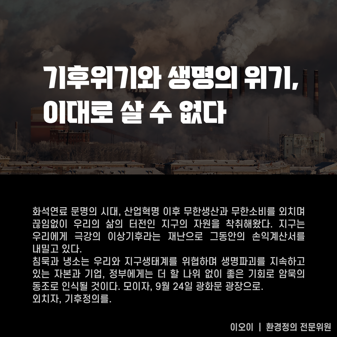 ..침묵과 냉소는 우리와 지구생태계를 위협하며 생명파괴를 지속하고 있는 자본과 기업, 정부에게는 더 할 나위 없이 좋은 기회로 암묵의 동조로 인식될 것이다. 모이자, 9월 24일 광화문 광장으로. 외치자, 기후정의를."
