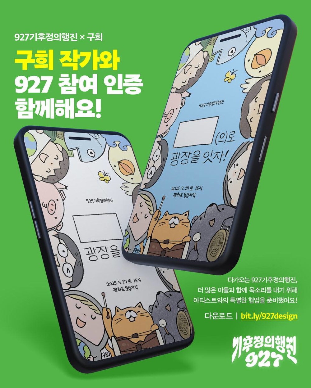 다가오는 927기후정의행진은 더 많은 이들과 함께 목소리를 내기 위해 다양한 아티스트와 협업을 이어가고 있습니다. 그 두 번째 협업 작가로, 웹툰 작가 구희 님과 함께 온라인 인